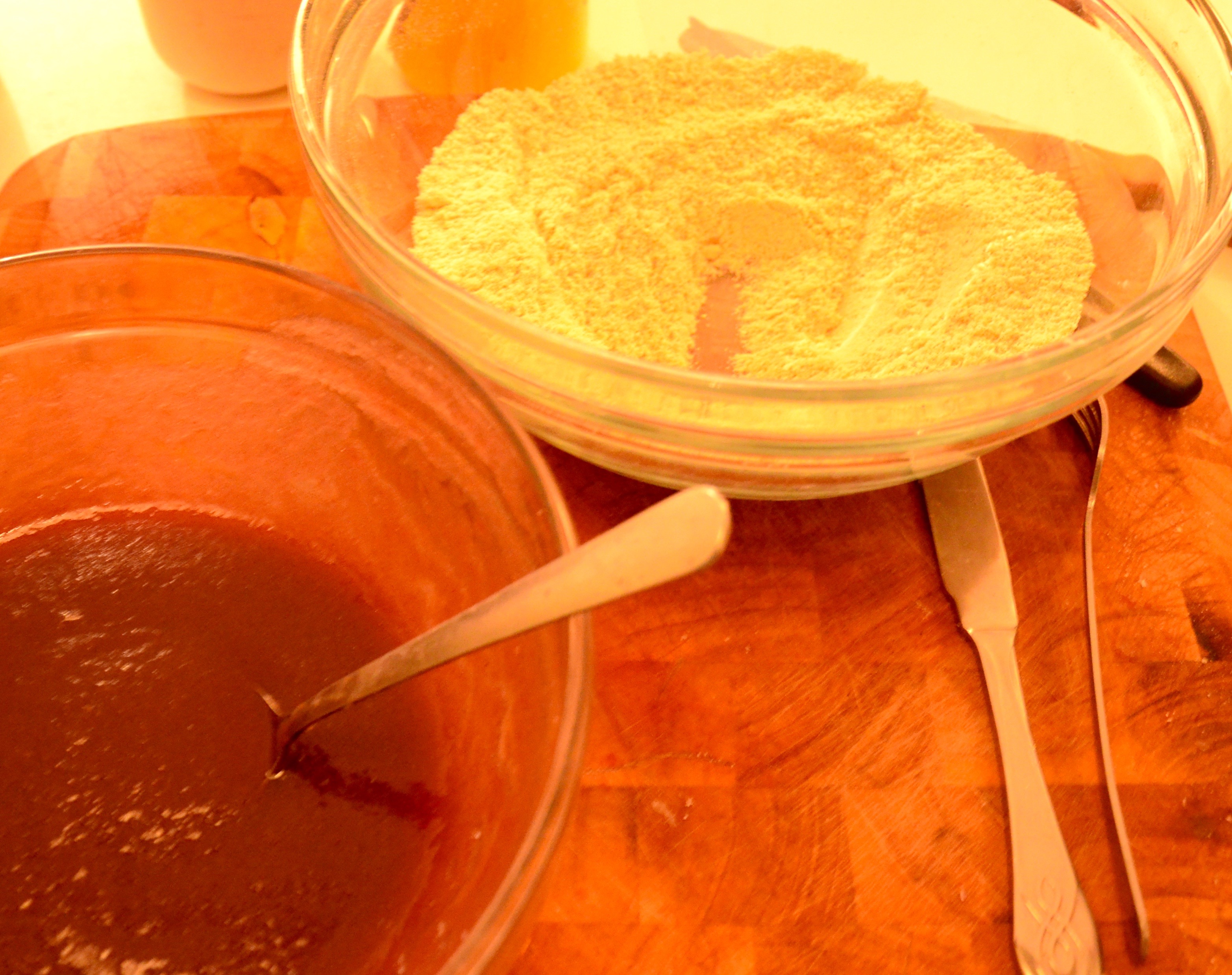 In another bowl bung in all your dry stuff. Sieve the baking powder if lumpy. Mix until all one colour. I used my sister’s lovely wooden bowl 🙂