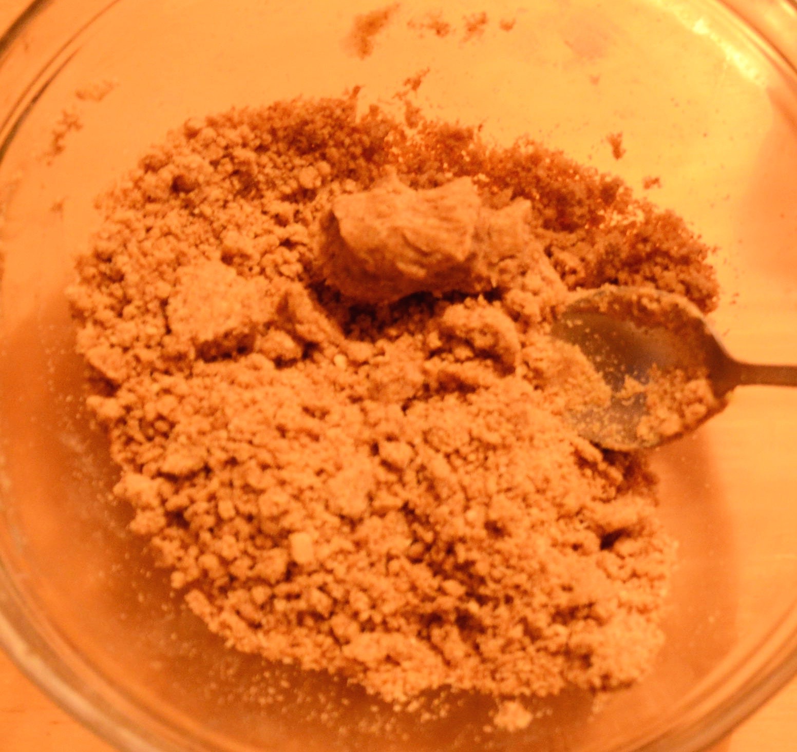 Put your dry ingredients into the wet. It will take a bit of pressing to get them pressed together. If you find it is looking more floury than bread-crumby (see pic) you may need to add a dessertspoon or two of almond milk. Start by sprinkling one spoon of milk over the ingredients and mix and press again. If still dryish add another spoon. It should just hold together when pinched. If you are happy with its crumbliness take a generous half a cup plus a dessertspoonful out and put it aside.