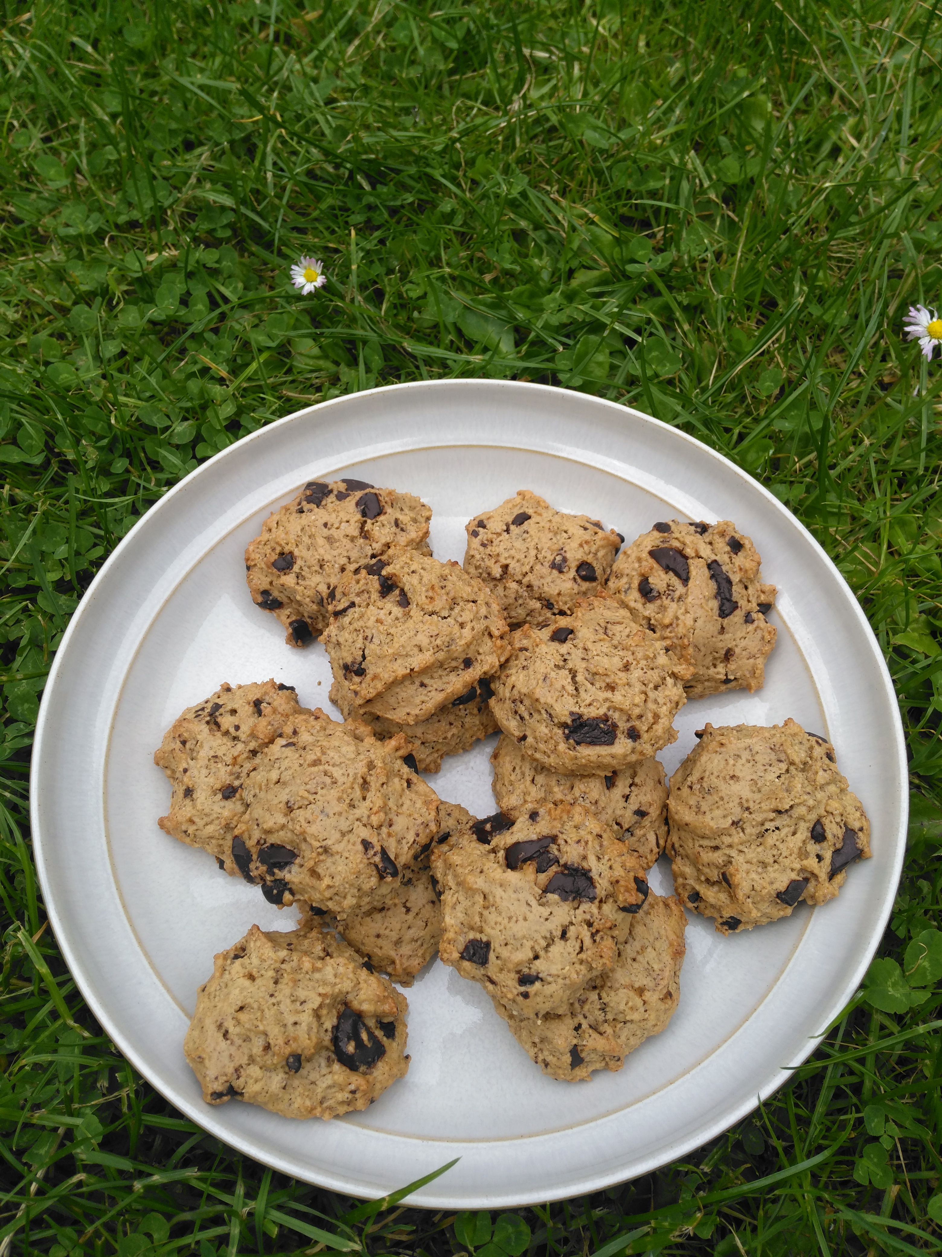 Ta-da! Viola! Vegan Cashew Chocolate Chip Cookies in the garden 🙂
