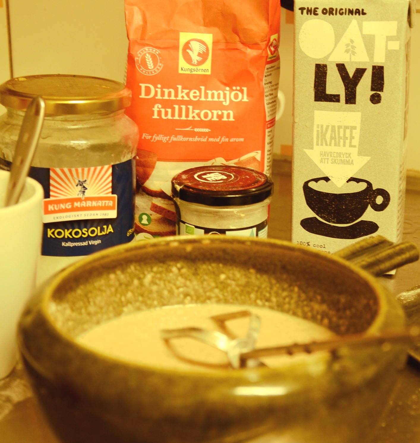 Sooo melt the said coconut oil on a medium heat. In a bowl… I used a cool green Swedish dish i found in the kitchen…you can use your own, no found Swedish dishes necessary. Where was I?