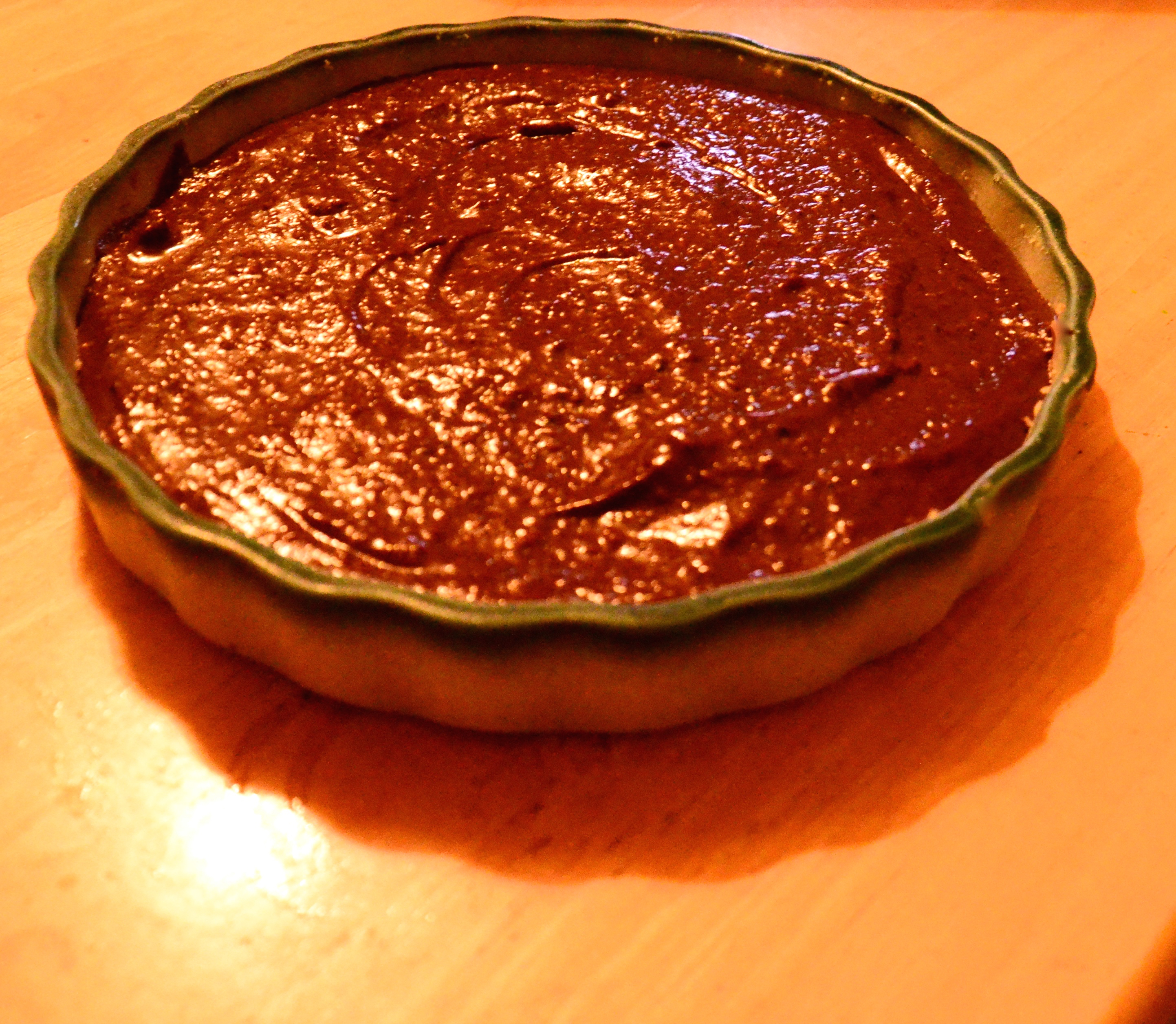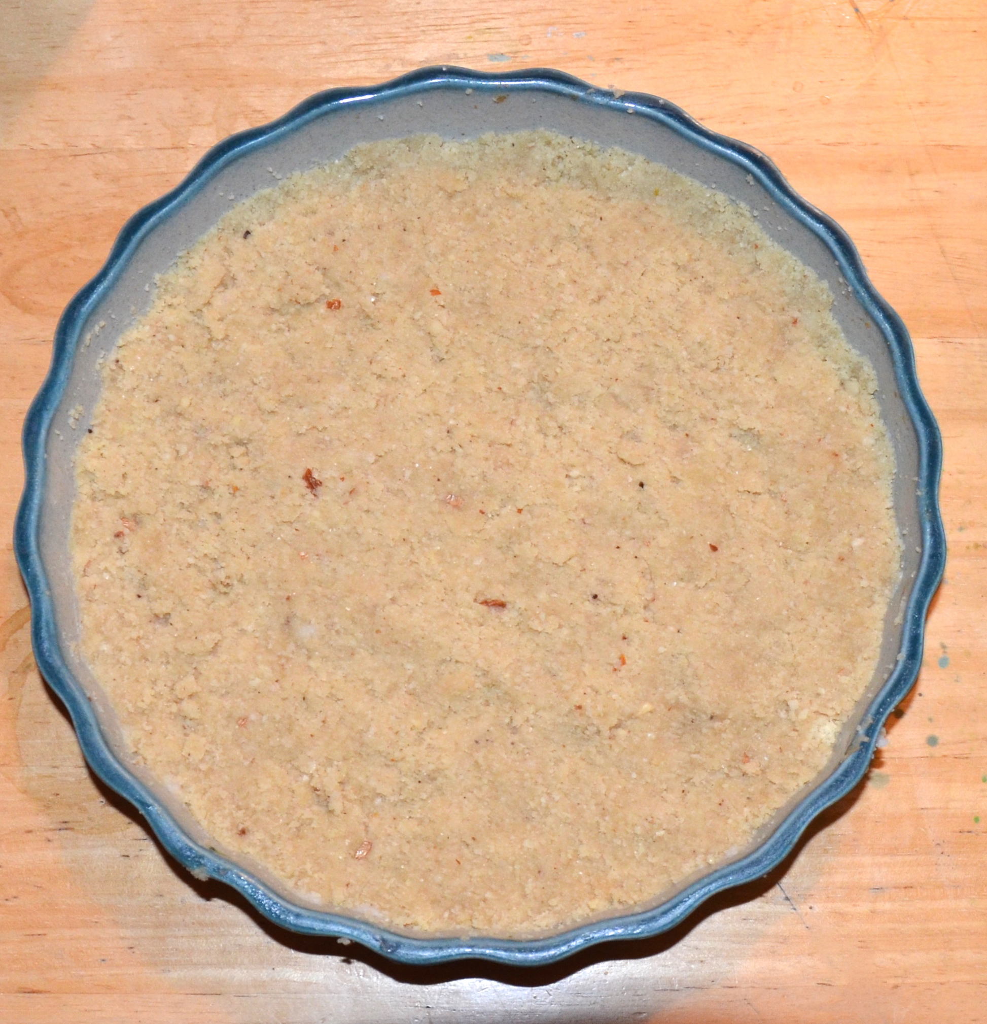 Now press it into your prepared tart tin/ pie pan. Try to do it evenly. This makes for a lovely thin crust. Cover it and pop it in the freezer while you prepare the topping.