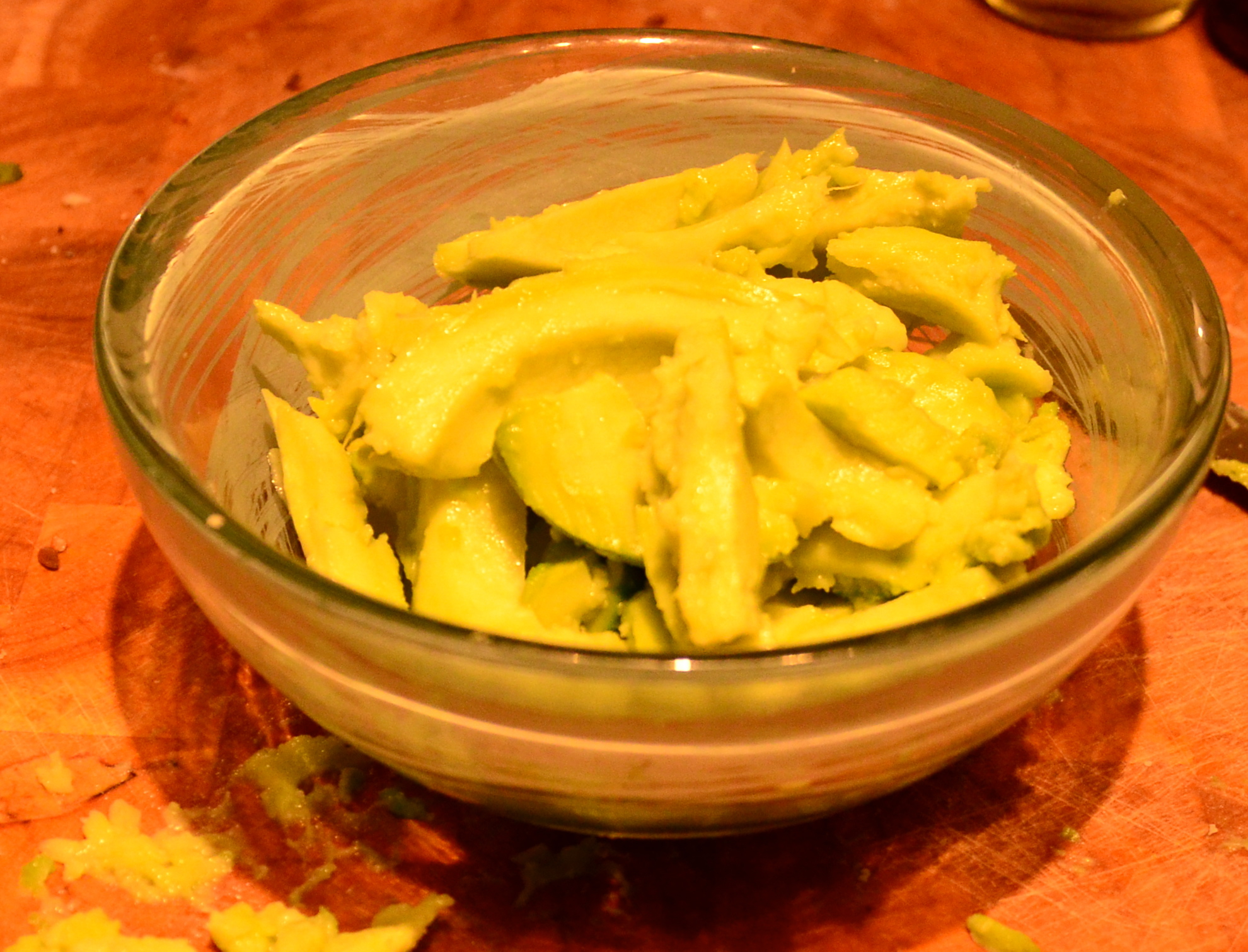 - One mashed avocado (ripe when dark sap green and there a little give when squeezed gently. Love nature! Hug an avocado!)