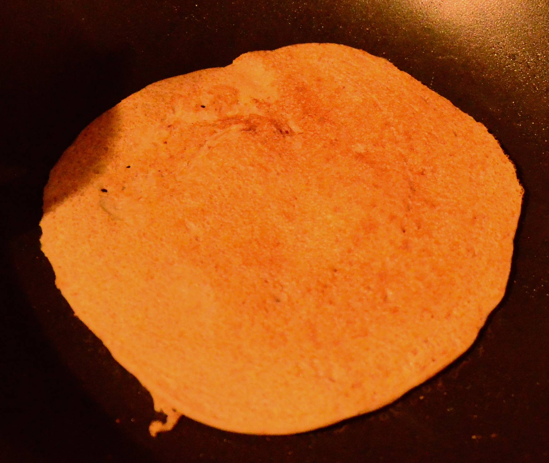 Put some coconut oil in your pan, set to a medium high heat. I actually did mine in a wok. Let it melt so it coats the pan. Pour in a ladle full of your pancake batter, swirl the pan a little so it is evenly spread. Leave it alone for a minute or two so it cooks. Peep under a corner to see if it browning, only then attempt The Flipping!!