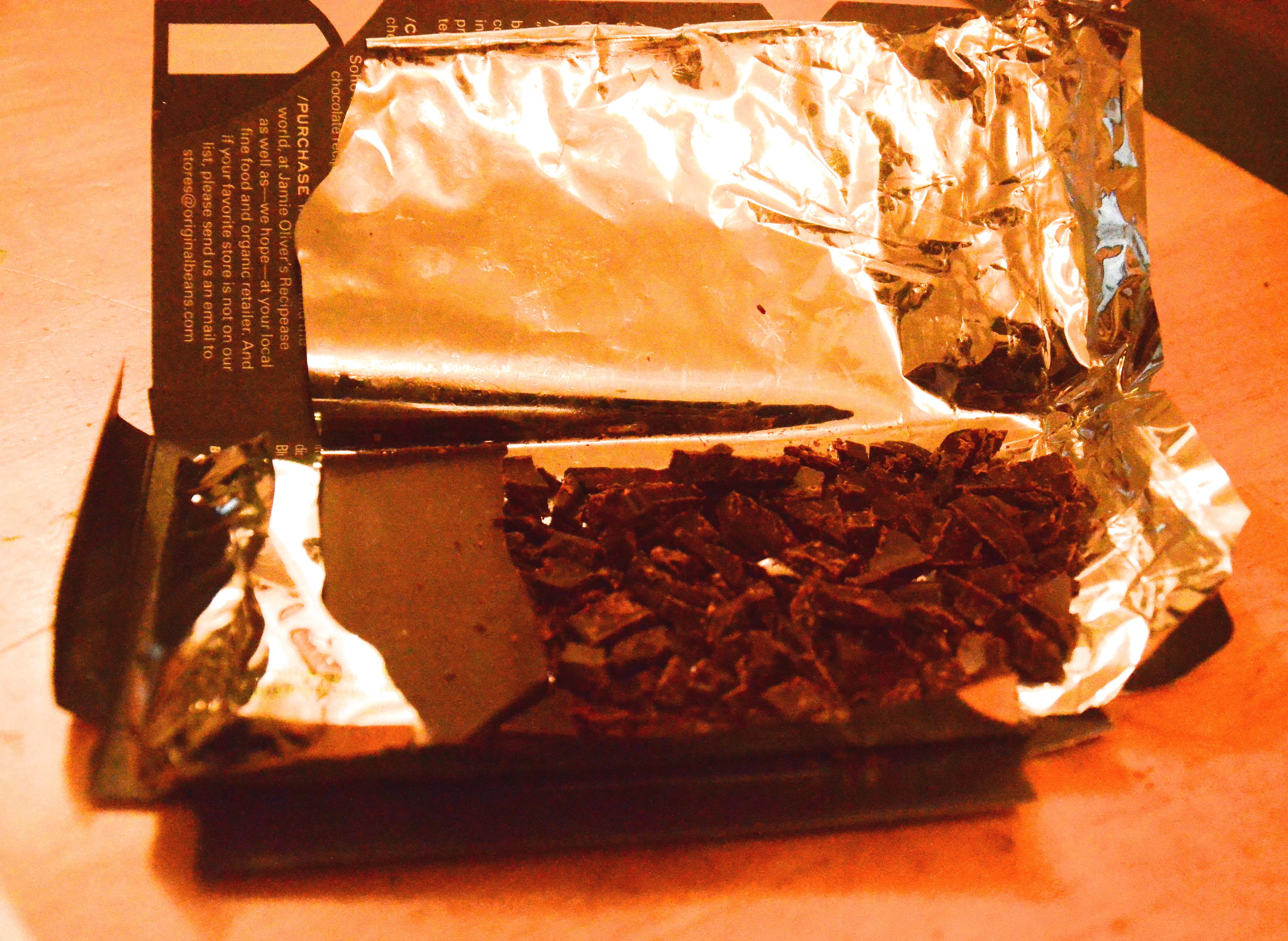 Chop your chocolate, it does not have to be super finely chopped as coming across the odd chunk is an extra treat! I used an organic one that has some wild harvest beans in it too..swanky. This is to be sprinkled on top of the brownie batter. Measure out your warm water.