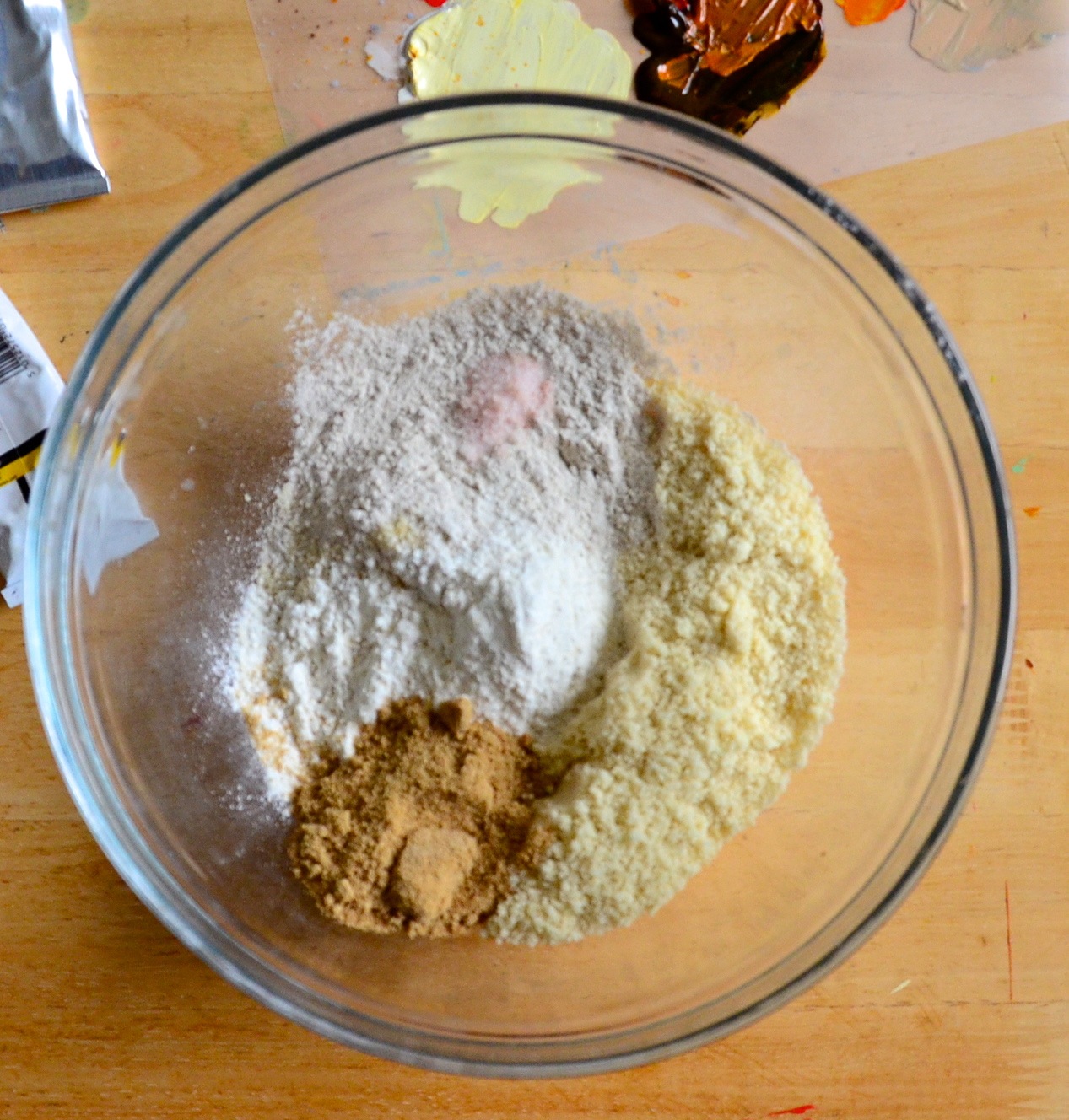 Mix your dry ingredients- except the toasted almonds. Add the dry to the wet mashing it together really well. It should be sticky but not sloppy- like a slightly wet drop cookie mix. It should be holding together 🙂 Now add in your toasted almonds and stir through evenly.